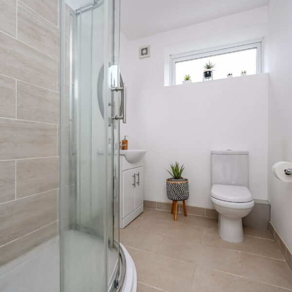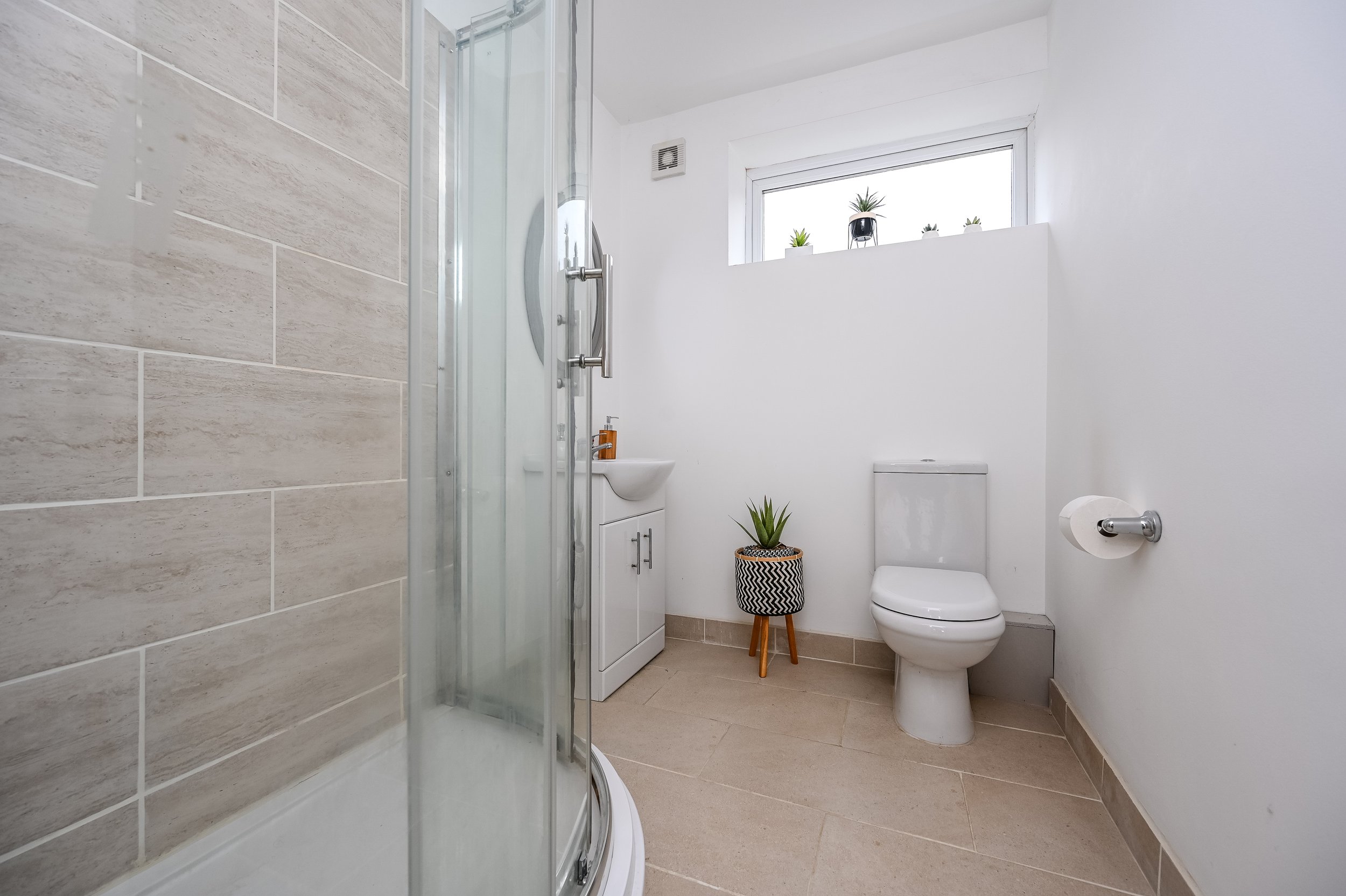 The bathroom is tiled and features a walk-in shower. It includes a toilet and sink, and a frosted UPVC window at the rear.