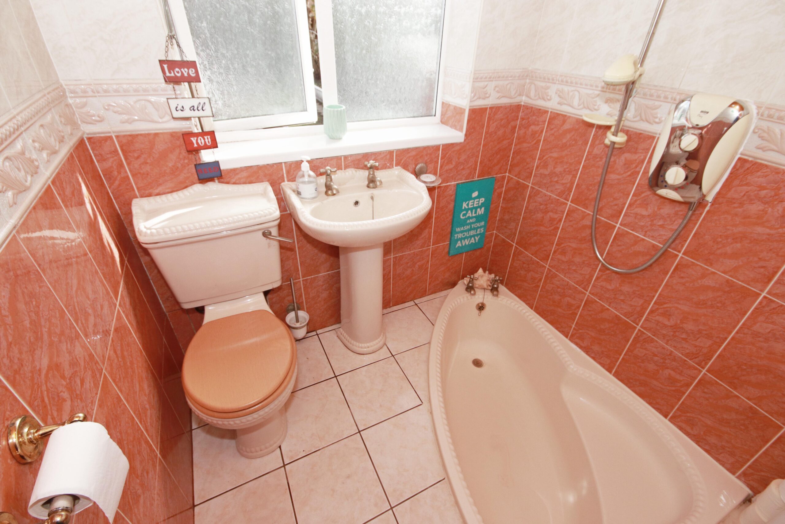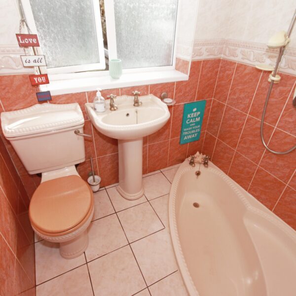 The first floor comprises three well-proportioned bedrooms—two doubles and one single—perfectly catering to the needs of families. The family bathroom features a sunken bath, pedestal sink, and toilet.